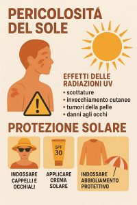 È consigliabile evitare l’esposizione solare nelle ore centrali della giornata, indossare indumenti protettivi e occhiali da sole con lenti certificate.